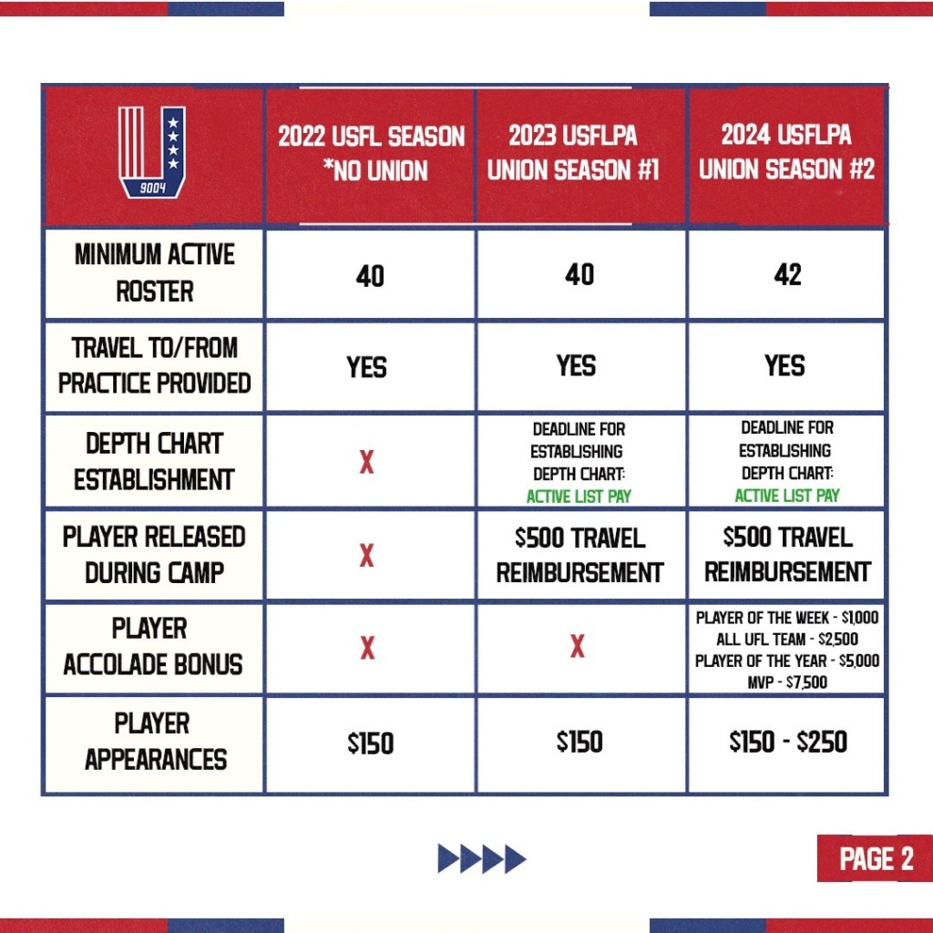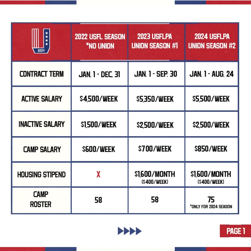 Excellent information. It seems the bargaining arrangement seems pretty good. Maybe there should be an additional player making $100,000, but overall it seems a step up. Another thing that would show faith in the league would be something for league veterans. lf a player had been in the USFL, XFL or been on the roster including NFL practice squads for 8 games last year players would receive an extra 1,000 annually. If they were in 2022 they would receive an additional $1,000. This would mean that a player making $55,000 for a 10 game season would actually make $57,000. Not that much of a difference, but it does take into consideration loyalty or a way to differentiate an increase for veterans. This is clearly a start, but something not so great the league would make it harder for veterans to make the team, but it gives veterans an opportunity to make a wee bit more than rookies.