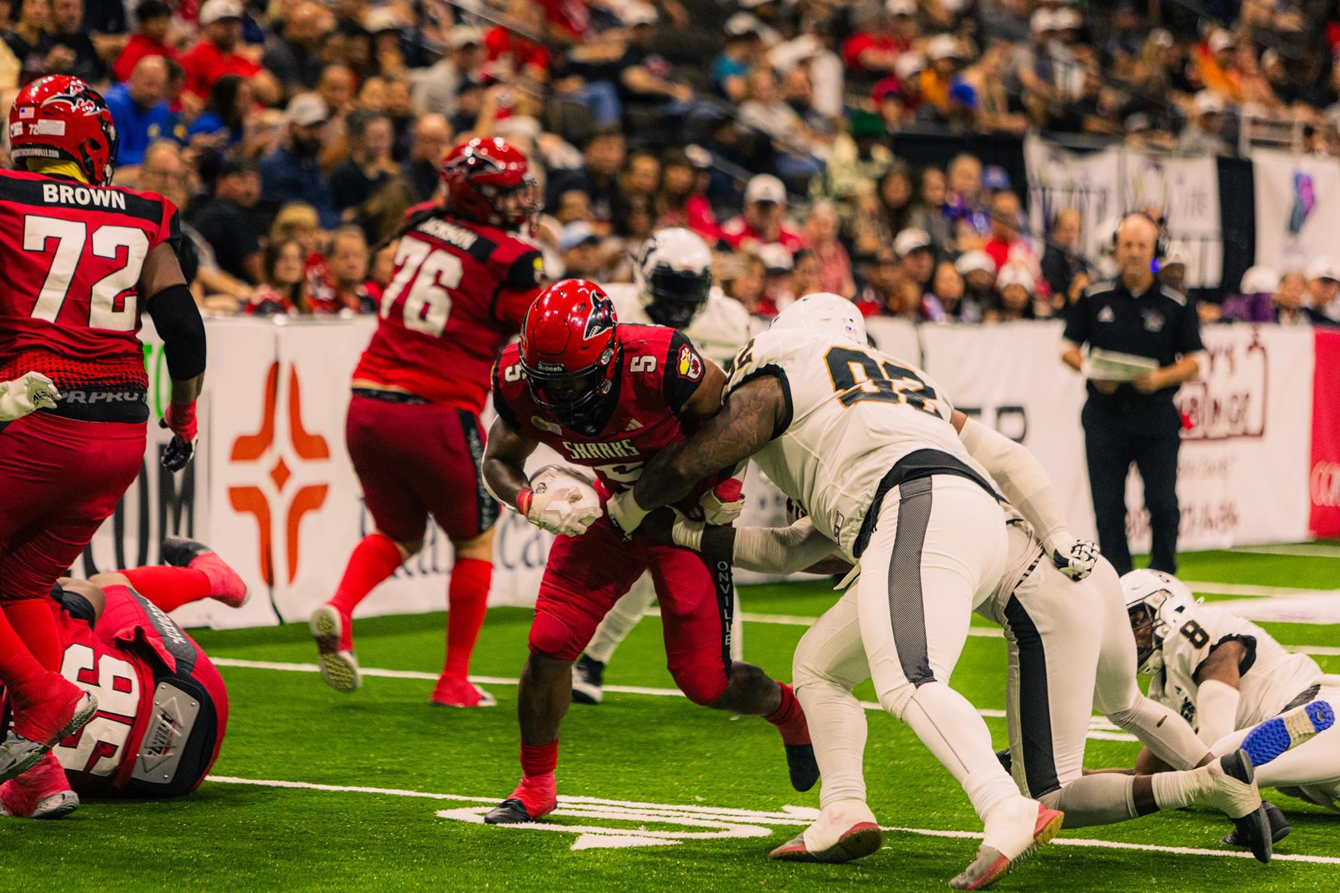 The Jacksonville Sharks survived a high-octane battle with the Arizona Rattlers, earning a 54-48 victory at VyStar Veterans Memorial Arena to improve to 7-3 on the season. Jacksonville scored in all three phases—offense, defense, and special teams—highlighted by Javaris Davis’s 40-yard pick-six and a fast start that saw the Sharks jump out to a 23-7 lead in the first quarter.