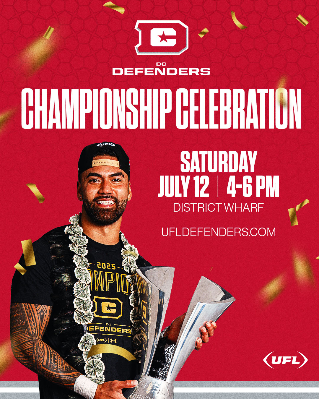 Local sports fans are invited to celebrate the DC Defenders victory in the 2025 UFL Championship at a free event taking place on Saturday afternoon, July 12, at The Wharf. This special event for fans gives them the opportunity to meet the Defenders and celebrate the magical 2025 season.