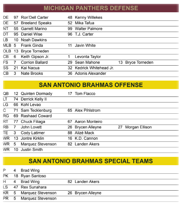 The Michigan Panthers prepare for their first road game as they prepare to take on the San Antonio Brahmas. The Panthers are coming off their most complete game of the season in which they defeated the Houston Roughnecks by a score of 34-20. For the second week in a row, the Panthers’ defense will face a team going through changes at the quarterback position as San Antonio’s quarterback was placed on IR following their week 3 loss to St. Louis.
