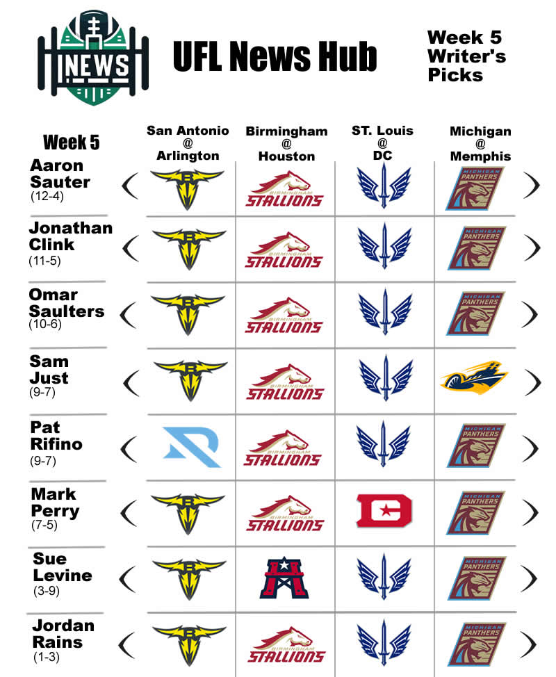 Predictions from the writers of UFL News Hub for week 5 of UFL football. Looking ahead at the week 5 matchups which will close the first half of the season. Week 5 will be the 2nd time so far this season in which all games are divisional matchups.