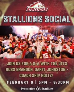 The Stallions are hosting an exclusive social event at Protective Stadium Club on Thursday, February 8th. The event, announced today in a press release from the UFL, runs from 5pm to 6:30pm, offering fans a unique opportunity to connect with the team and league executives.