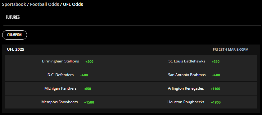 UFL Championship Futures Odds