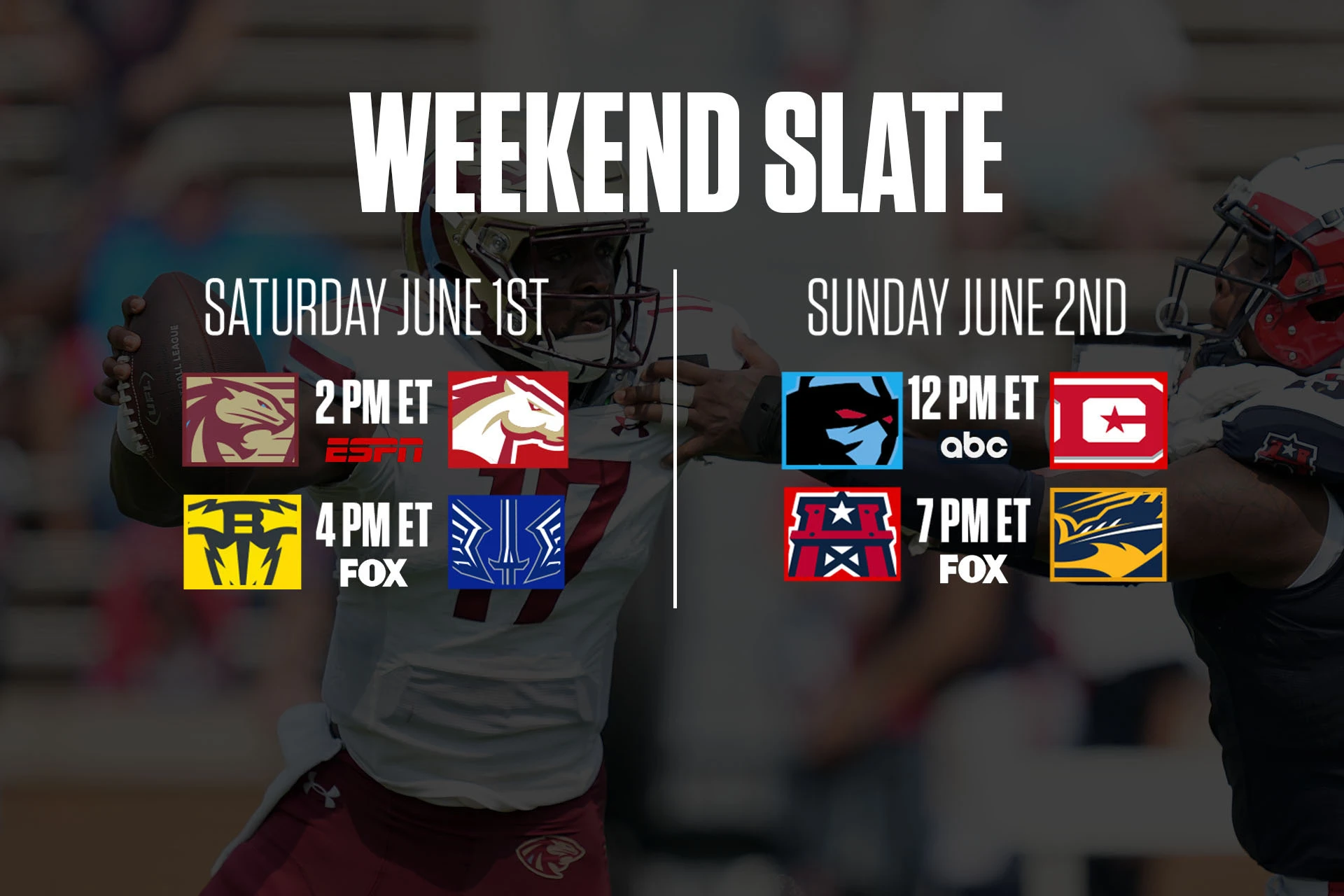 For those wondering about what channels are the football games on today, there are 2 UFL games on the agenda for Sunday, June 2.