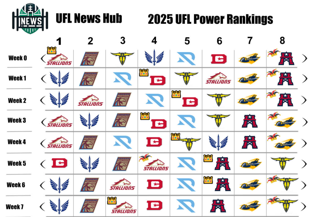 The St Louis Battlehawks continue to hold the top spot of the power rankings, but it remains very congested at the top with there being 4 teams holding a 5-2 record. Week 7 of the UFL saw every game won by the team ranked higher in the power rankings.