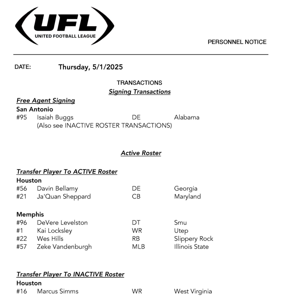 The transactions continue a busy week of roster movement as UFL teams adjust their lineups heading into the middle portion of the season. While San Antonio takes a chance on Buggs despite his off-field concerns, Memphis made the most significant moves by activating four players across multiple positions.