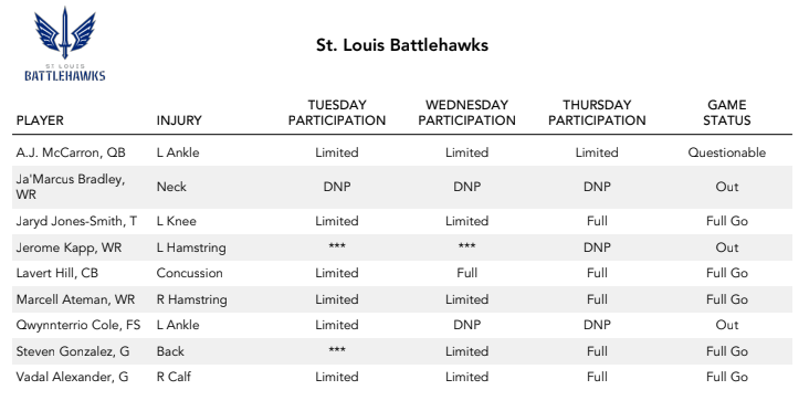 The Battlehawks will be without Marcell Ateman, Special Teams Ace Jerome Kapp, and Qwynnterrio Cole. They do return A.J. McCarron, and Vadal Alexander both of whom did not play last week. Ben DeLuca was taken off Injured-Reserve last week and now on the inactive roster for week 10.